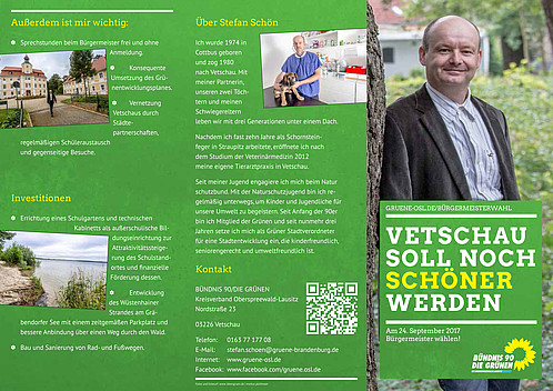 Bei der Wahl zum Bürgermeister in Vetschau holte Stefan Schön am 24. September 2017 respektable 17,4% der Stimmen im ersten Wahlgang. Er zwang damit den Amtsinhaber Bengt Kanzler (CDU) in die Stichwahl, welche er knapp mit 51,7% für sich behaupten konnte. Hier findet ihr die genauen Zahlen: Amtliches Wahlergebnis