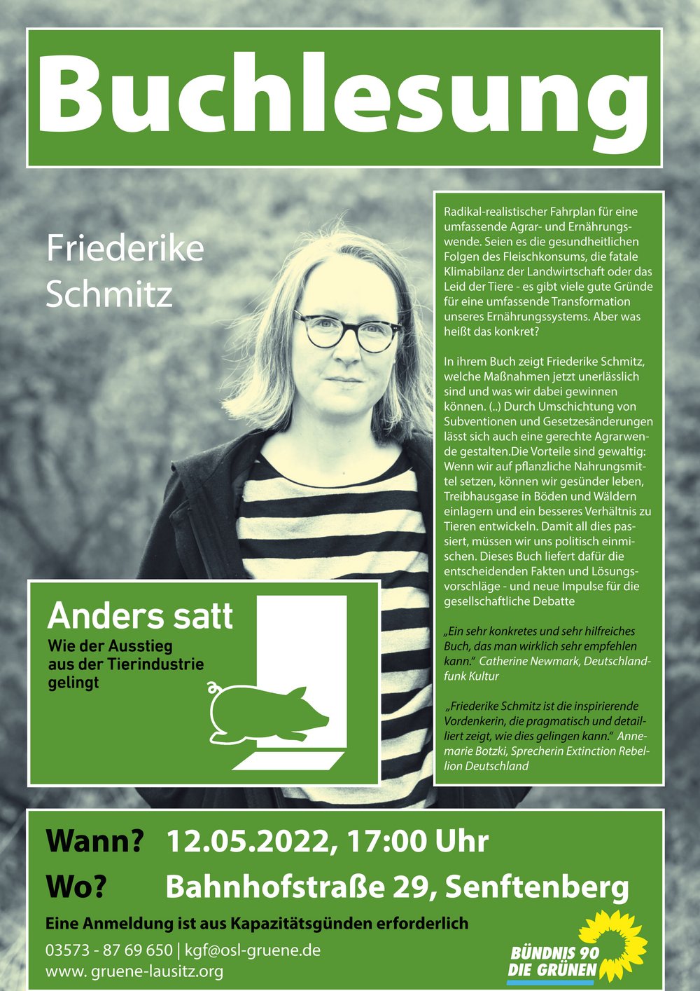 Buchlesung und Diskussion über die Art, wie wir essen und anders satt werden können mit Friederike Schmitz und ihrem aktuellen Buch „Anders satt – Wie der Ausstieg aus der Tierindustrie gelingt.“ Am 12. Mai um 17 Uhr in Senftenberg, Bahnhofstraße 29. Um Anmeldung wird aus Platzgründen gebeten: Tel 03573 – 87 69 650 oder kgf@osl-gruende.de