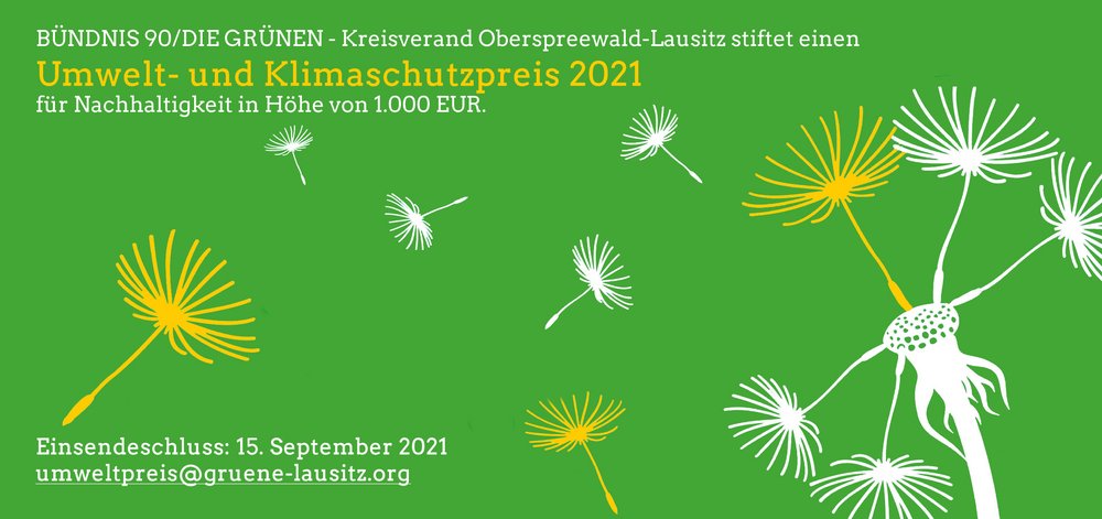 Der Kreisverband Bündnis 90/Die Grünen OSL stiftet in diesem Jahr erneut einen Umwelt- und Klimaschutzpreis in Höhe von 1.000 Euro. Mit dem Preis fördert die Partei gelebten Umwelt- und Klimaschutz, Umweltbildung und nachhaltiges Wirtschaften. Bewerben kann sich jede*r, die/der auf diesem Gebiet Neues oder Bewährtes bietet. Die Preisverleihung soll verantwortliches und nachhaltiges Handeln honorieren und künftige Projekte in diesen Bereichen unterstützen.
