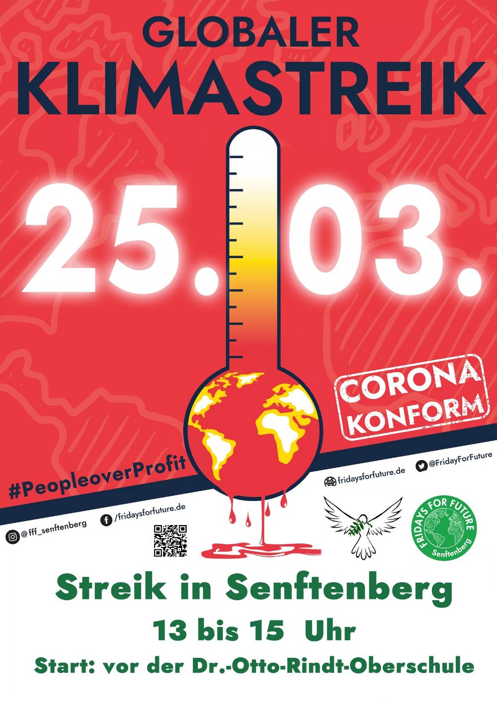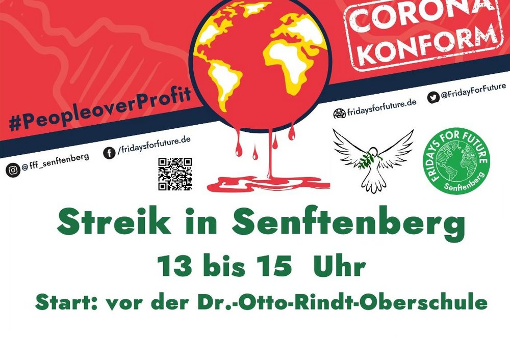 Am Freitag, den 25.03.2022 ist der nächste weltweite Klimastreiktag. Auch in Senftenberg gehen die Schülerinnen und Schüler wieder auf die Straße, um für einen Erhalt ihrer Zukunft zu demonstrieren. Ausgehend von der Dr.-Otto-Rindt-Oberschule wird die Demonstration ab 13:00 Uhr über die Calauer Straße und die Bahnhofstraße zum Marktplatz ziehen, wo die Abschlusskundgebung stattfinden wird.