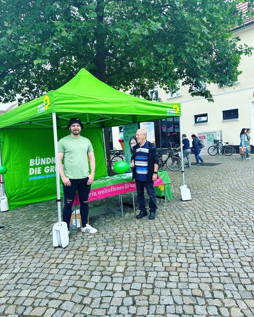 Punkt 10 Uhr stand unser wunderschönes grünes Pavillonzelt mit allerlei Werbematerialien, eingebettet zwischen „Stadtmodell“ und Platane direkt am Markt und wartete auf die ersten Besucher*innen. Wir führten interessante Gespräche mit Senftenberger*innen zu Bildungspolitik, speziell in Senftenberg aber auch Fachkräftemangel, Inklusion, Weiterentwicklung des Marktplatzes, autofreie Innenstädte, Nahverkehrskonzepte (Stichwort Carsharing, Ausbau ÖPNV) und Zuwanderung. Kommunale Sorgen, wie die durch den Lausitzring verursachte Lärmbelästigung und die Trockenheit bedingten Wasserverlust des Schlossteiches wurden ebenfalls angesprochen. Tiefer eingestiegen sind wir in die Diskussion mit einer Passantin zum Thema Atomkraft und die damit verbundenen Probleme für die Folgegenerationen. Wir kamen auf den gemeinsamen Konsens, dass die Vorteile (billiger Strom) den Nachteilen (Halbwertszeit des Atommülls von mehreren 100.000 Jahren) nicht aufwiegen.