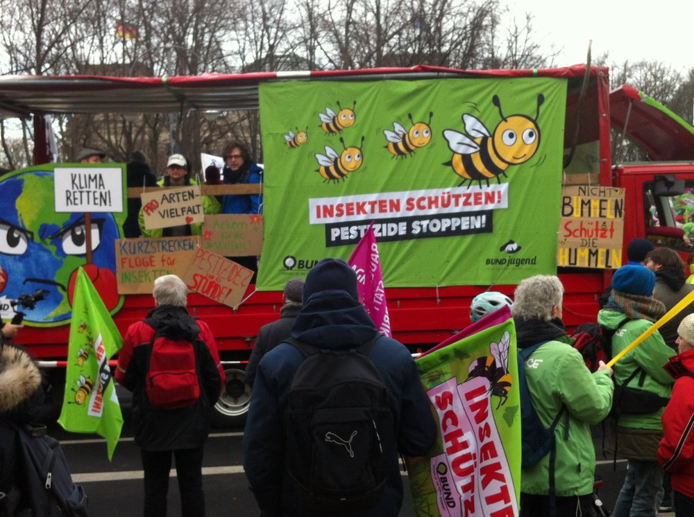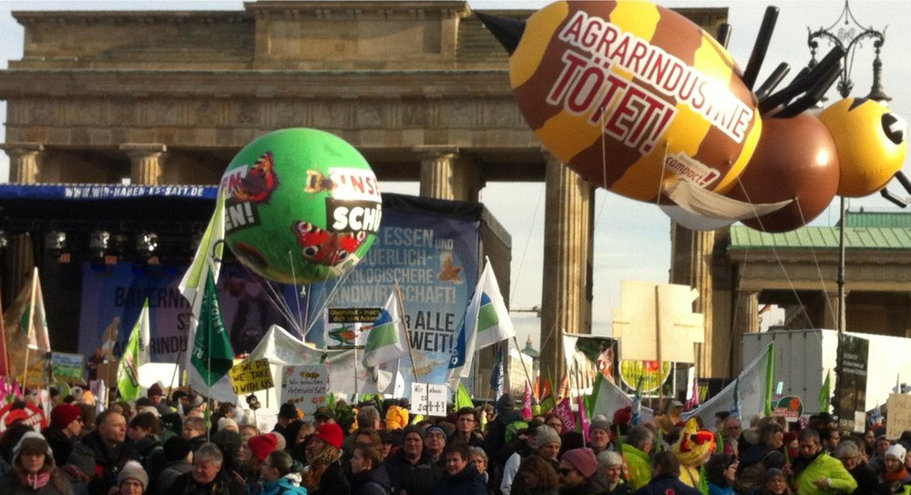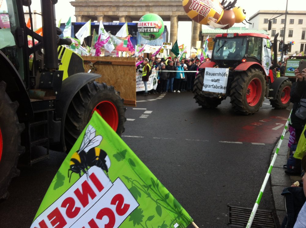 Jedes Jahr im Januar findet die Demo „Wir haben es satt“ in Berlin statt. www.wir-haben-es-satt.de Anlass ist die zur gleichen Zeit startende Ausstellung „Grüne Woche“. Eine internationale Agrarausstellung, zu der auch zahlreiche Agrarminister aus der ganzen Welt anreisen und in Berlin tagen. Die Organisatoren der Demonstration überreichten ihren Protestbrief vor Beginn des Protestmarsches an die tagende Agrarministerkonferenz im Auswärtigen Amt. Sie fordern, dass die Politik kleinbäuerliche und ökologische Betriebe fördert und damit die Umstellung zu einer nachhaltigen und umweltverträglichen Landwirtschaft.